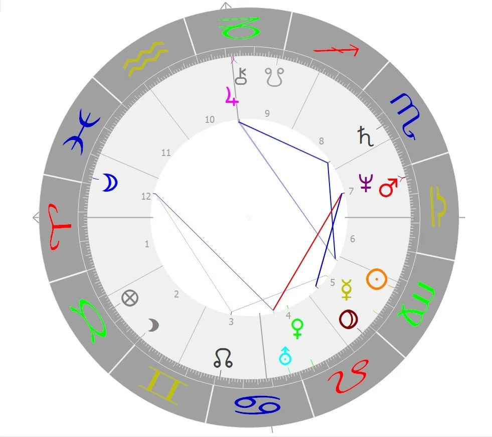 Wenn wir uns die Beziehung von ihrer Seite ansehen, scheinen die Themen Macht und Kontrolle eine große Rolle zu spielen. Sein Mars bildet eine Konjunktion mit ihrem Aszendenten. Es liegt auch eine Pluto Saturn Konjunktion vor – wo sie loslassen wollte hielt er innig fest. Ihre Wunde, ihre Verstrickung mit dem Thema Erbe und Rang wurde durch ihm nur noch mehr gefestigt und hielt sie im gewissen Maße vielleicht auch gefangen in ihren alten Mustern und Gefühlen, ein Zustand bei dem jeder die Kontrolle verloren hätte.