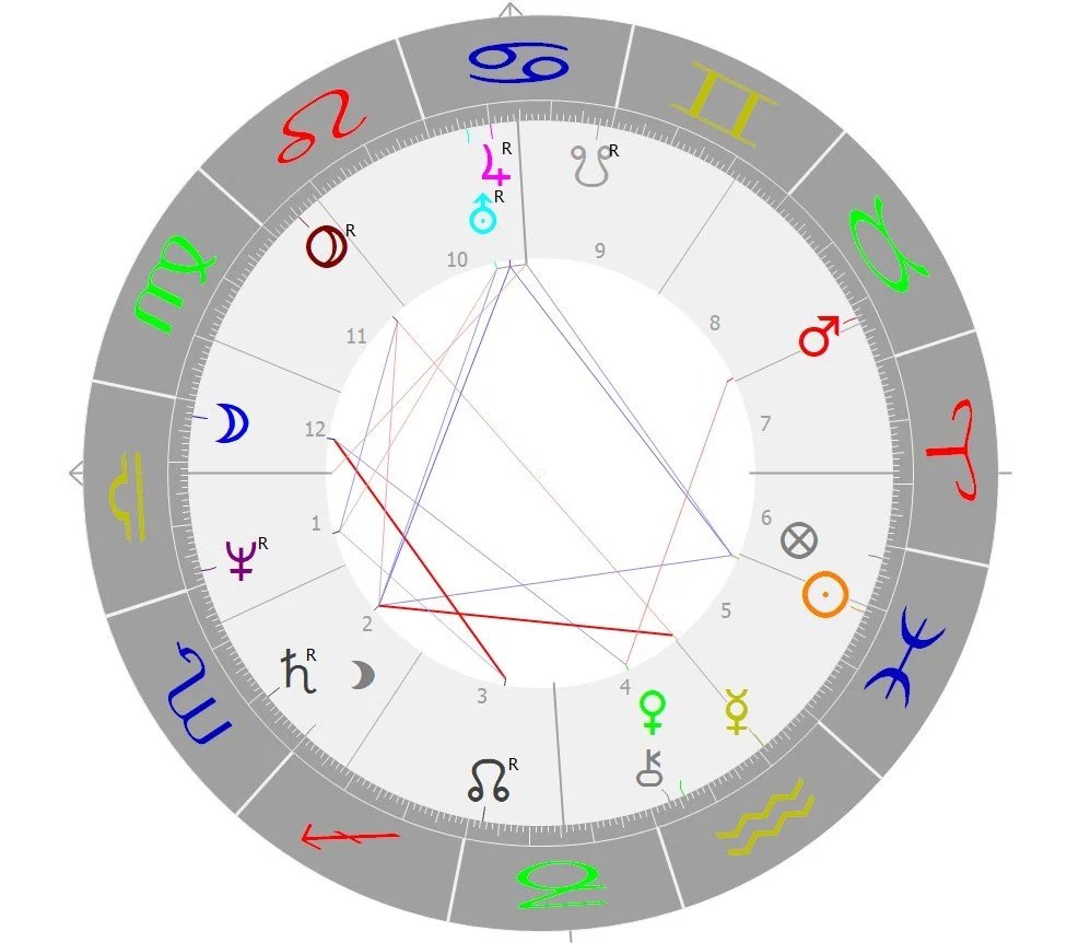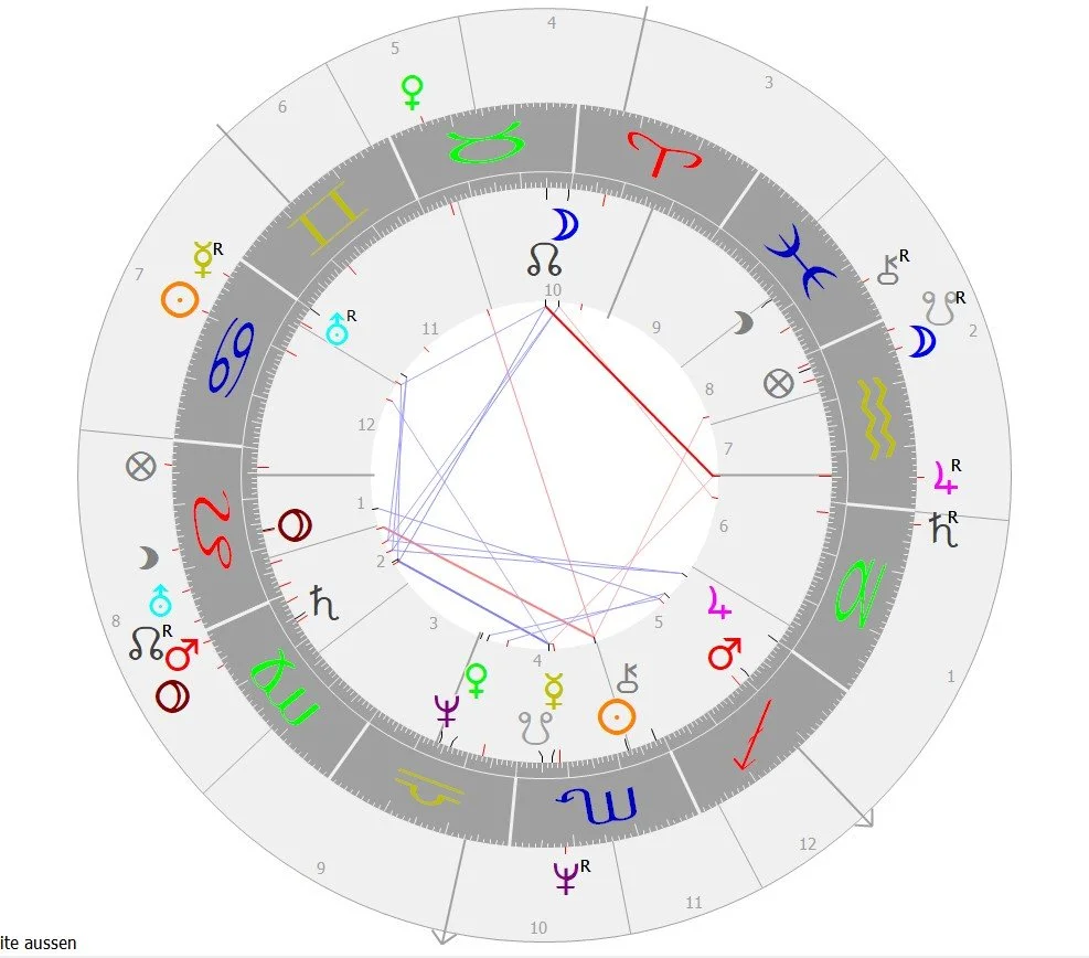 Aufgrund all dieser Prägungen macht auch ihre Mondstellung viel Sinn. Sie sehnte sich nach Stabilität, nach Zuverlässigkeit und koppelte sich wahrscheinlich häufig emotional ab um mit dem Erlebten umgehen zu können (Mond im Wassermann in 2). Ihr Wunsch nach Struktur, Sicherheit und Vertrauen wurde jedoch immer wieder verletzt (Chiron in 2). Ihre Mutter verband sie wohl eher mit einer gewissen Unzuverlässigkeit (Mond Opposition Uranus). Und sowohl sie, als auch das Stellium im 8. Haus, werfen herausfordernde Quadrate auf ihre Venus bzw. ihr Selbstbewusstsein. Trotz der relativ guten Stellung im 5. Haus im Domizil, wird sie ausschließlich von herausfordernden Aspekten und Planeten aspektiert, was ihrer vollen Entfaltung sicherlich stark im Weg stand.